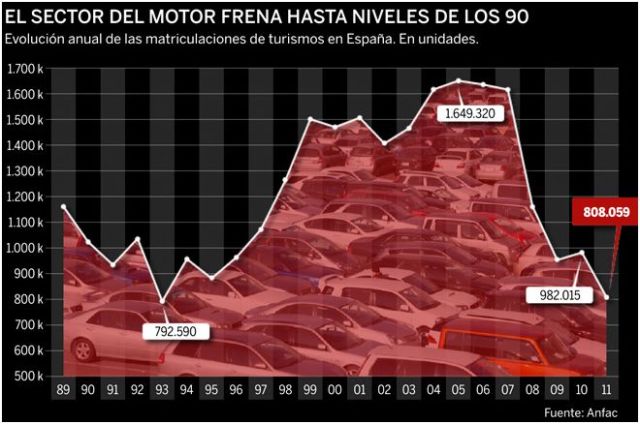 El automóvil español registró en 2011 ya su tercer año consecutivo en que el mercado no consiguía superar el millón de coches vendidos, a años luz de la alocada cota de los 1,6 millones de unidades que se superó de forma persistente entre 2004 y 2007. Pero también lejos del potencial de 1,3 o 1,4 millones de coches que los expertos del sector colocan como el tamaño natural anual que debería mantener el mercado español.