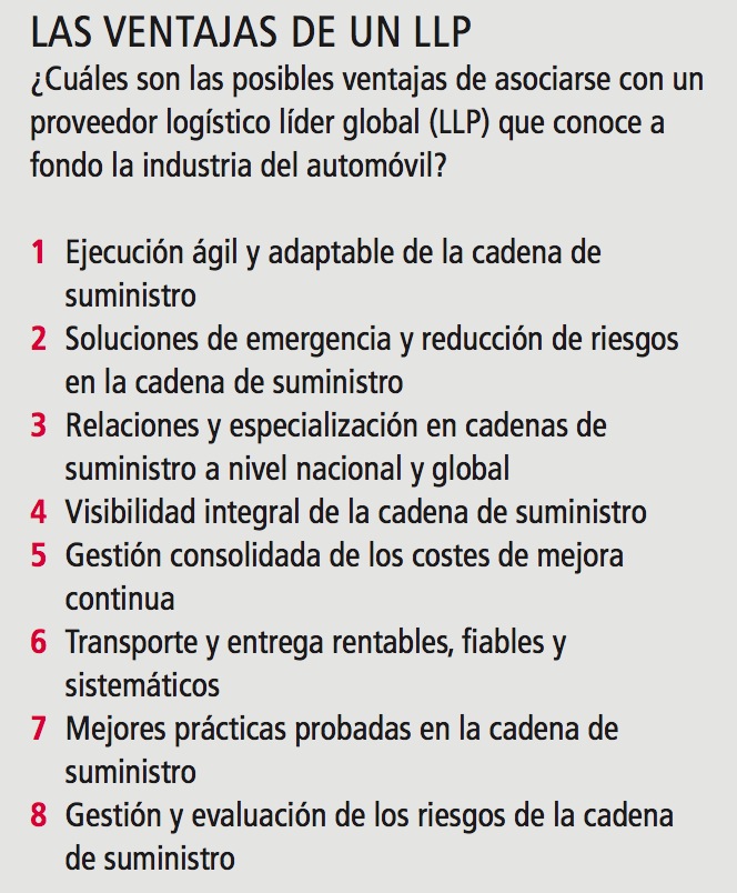 - Para favorecer a la cadena de suministro automovilística globalmente regional, que requiere rentabilidad y capacidad de respuesta, hace falta una nueva logística ágil y táctica a escala global.