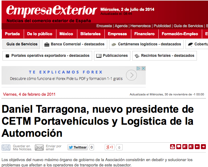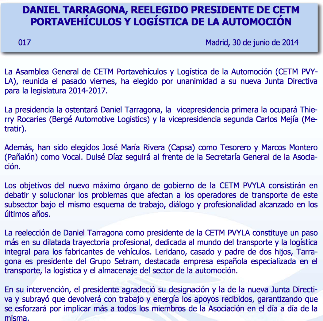 Barcelona, 1 de julio del 2014.- Daniel Tarragona, Presidente del Grupo SETRAM, ha renovado su presidencia al frente de CETM Portavehículos. La revista Transporte Profesional (revista oficial de la CETM) ha publicado la siguiente información: