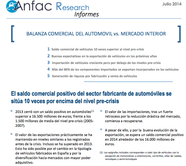 Barcelona, 20 de julio del 2014.- El sector del automóvil en España cerrará el presente ejercicio con un saldo comercial positivo de 16.131 millones de euros, lo que supondrá una disminución del 2,2% en comparación con las cifras del año anterior, según el último informe Anfac Research titulado ‘Balanza Comercial del Automóvil vs. Mercado Interior’. El documento pone de manifiesto que el valor de las exportaciones se ha mantenido en niveles similares a los anteriores a la crisis económica, gracias, principalmente, al cambio en la tipología de vehículos fabricados en España y por la diversificación hacia mercados con mayor poder adquisitivo. El saldo comercial de vehículos es diez veces superior al de antes de la crisis. Los datos de Anfac Research indican que las exportaciones finalizarán 2014 con un superávit de 29.725 millones de euros, un 13,3% más que en 2013, mientras que las importaciones también cerrarán el año en positivo, con 13.594 millones de euros, un 39,4% más.