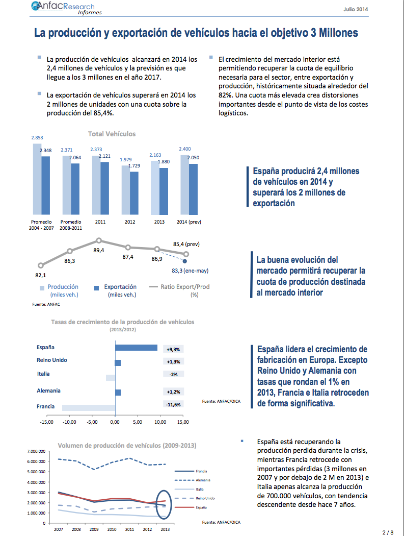 Por otro lado, la previsión es que la producción de vehículos en España alcance 2,4 millones de unidades en 2014 y que llegue a 3 millones de unidades en 2017, mientras que la estimación es que la exportación de coches alcance un volumen de dos millones de unidades este ejercicio, con una cuota sobre el total producidos del 85,4%. Desde Anfac indican que la mejoría del mercado automovilístico español está permitiendo recuperar la cuota de equilibrio necesaria para el sector entre exportación y producción, que se establece en el 82%, puesto que una cifra más elevada “crea distorsiones importantes desde el punto de vista de costes logísticos”. Durante la segunda mitad del año, se espera una aceleración del crecimiento de las exportaciones, después de un primer semestre que ha estado marcado por los cambios de modelos en las líneas de fabricación, lo que ha supuesto una reducción de producción. ANFAC indicó que la adjudicación de nuevos modelos a las plantas españolas, con una inversión de 3.500 millones de euros desde 2012, potenciará las exportaciones y la presencia de coches ‘españoles’ en el mercado, gracias a la competitividad de las plantas nacionales. En 2014 se empezarán a ensamblar seis nuevos vehículos en España.