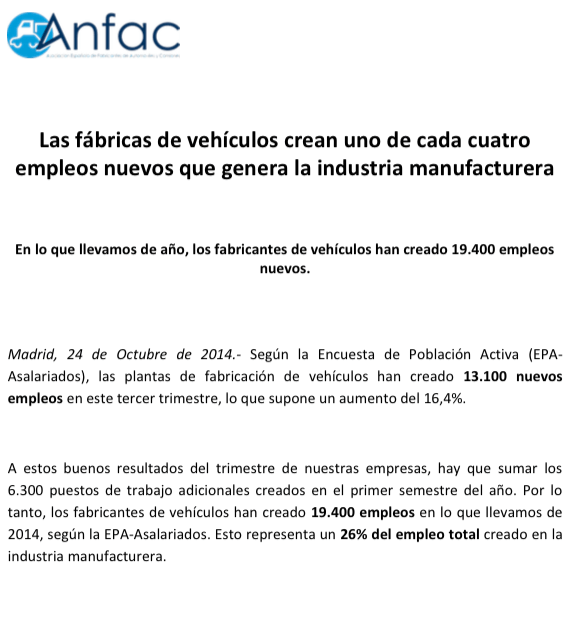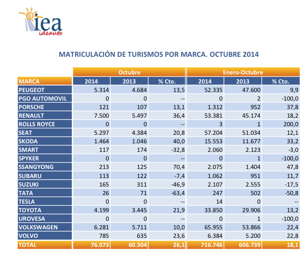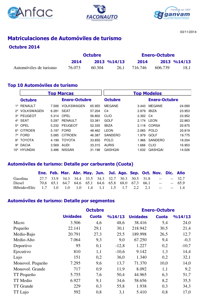 David Barrientos, Director de Comunicación de ANFAC afirmó que “El mes de Octubre mantiene la tendencia alcista del mercado de automóviles. El fin del Plan PIVE 6 ha provocado una aceleración en el mercado en los últimos días que se ha traducido en un notable incremento de las matriculaciones. Ante las dudas económicas que comienzan a surgir en algunos países de nuestro entorno, España debe seguir dando pasos adelante y aprovechando sus oportunidades, mantener la senda del crecimiento y creación de empleo, apoyándose en sectores y medidas que impulsen la confianza del inversor. El automóvil y el Plan PIVE son claros ejemplos de colaboración público- privada que proporcionan crecimientos sostenidos en la demanda interna y, por extensión, un aumento en la recaudación fiscal y en la riqueza del país, acelerando el ritmo de recuperación económica. La economía española sigue creciendo y lo hace impulsada por medidas de estímulo como el Plan PIVE y el Plan PIMA Aire. El mercado de turismos acumula seis trimestres de crecimiento continuado, pero el automóvil todavía tiene potencial para seguir creciendo. Por eso, en este entorno actual, es más necesaria aún la continuidad de los Planes PIVE para mantener la solidez de la demanda interna. Apostar por un mercado interno más potente nos ayudará a tener una economía más estable y segura a largo plazo.”