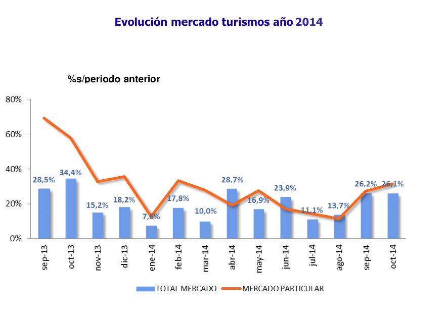 Un mes más, todos los canales presentan tasas positivas de crecimiento. El canal particular es el que de nuevo marca la pauta del crecimiento, con un alza en el mes del 31,5% y un total de 50.539 matriculaciones. Hasta Octubre, este canal presenta unos números fantásticos, con un incremento del 22,2% y un volumen de 393.336 unidades, representando el 55% del mercado. Por otro lado, el canal de empresas continúa con la tendencia positiva e incrementa sus matriculaciones un 17% en el mes con 21.914 unidades. Es el undécimo mes de subidas consecutivas en este canal, que acumula un crecimiento del 12,2%, con 176.586 unidades. Por último, el canal de alquiladores registró en el mes de Octubre unidades, un 15,2% más. En los diez primeros meses del año, este canal acumula un alza del 15,1% con 146.824 matriculaciones.