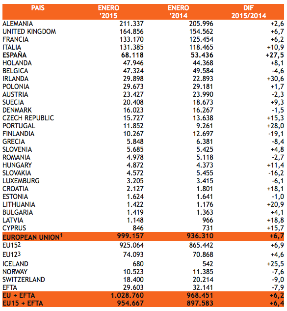 Barcelona, 18 de febrero del 2015.– Según informa el portal motorpoint: “Durante el primer mes del ejercicio 2015 las ventas de automóviles en Europa han registrado un crecimiento del 6,7% con respecto al mismo periodo del año anterior. Se han matriculado casi un millón de coches (999.157 unidades), que representa un incremento consecutivo en los últimos meses. Los mayores aumentos de ventas han sido por este orden: Irlanda (30%), Portugal (28%), España (27,5%), Islandia (25,5%) y Lituania (20%). El grupo Audi-Volkswagen (VW, Audi, Skoda, Seat, Porsche) lidera el mercado europeo con mas de la cuarta parte del mismo. Todo hace indicar que la crisis ha comenzado a remontar, sobre todo en un sector industrial y comercial que supera el 12 por ciento de la economía mundial. Se venden más coches, aunque no son todas las marcas o grupos de fabricantes las que gozan de estas bondades del mercado. Solo superan la media de este crecimiento el Grupo VW, Renault, BMW, Daimler, Toyota, Nissan, Hyundai, etc. Mitsubishi rompe las estadísticas con un crecimiento que casi dobla las matriculaciones en este mismo periodo del año anterior. Bajan marcas como Citroen, Lancia, Alfa Romeo, Mazda, Suzuki, Jaguar, Land Rover y Honda”.