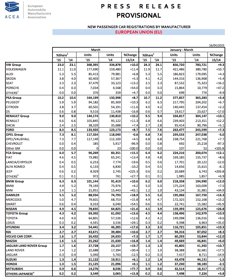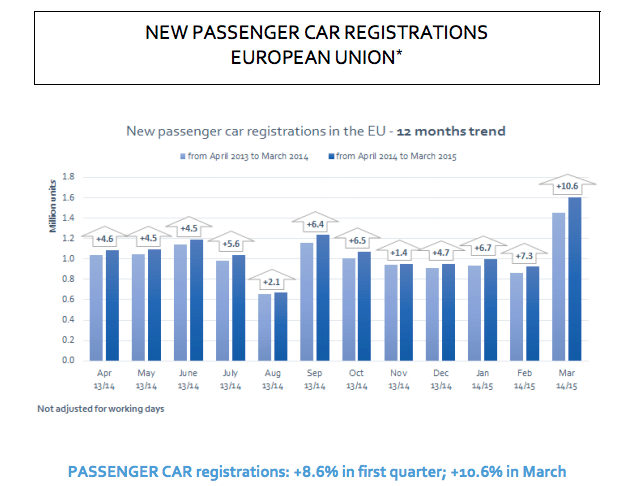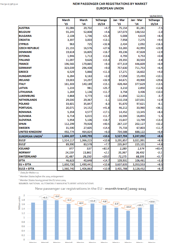 En porcentajes anuales, de marzo de 2014 a marzo 2015, el mercado de turismos aumentó un Europa un 10,6%, mientras que en España el crecimiento registrado ha sido del 40,5%. En el mismo periodo, el país con mayor aumento ha sido Portugal con un 41,8% en las ventas de coches.