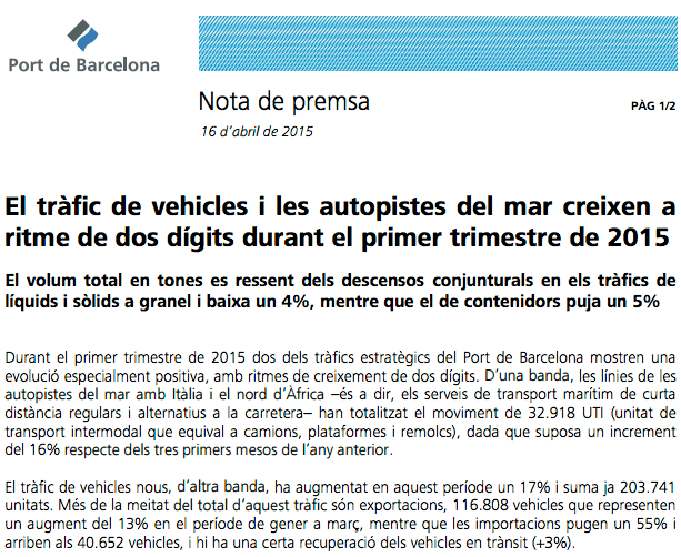 Barcelona,16 d’abril de 2015.- Durant el primer trimestre de 2015 dos dels tràfics estratègics del Port de Barcelona mostren una evolució especialment positiva, amb ritmes de creixement de dos dígits. D’una banda, les línies de les autopistes del mar amb Itàlia i el nord d’Àfrica –és a dir, els serveis de transport marítim de curta distància regulars i alternatius a la carretera– han totalitzat el moviment de 32.918 UTI (unitat de transport intermodal que equival a camions, plataformes i remolcs), dada que suposa un increment del 16% respecte dels tres primers mesos de l’any anterior.