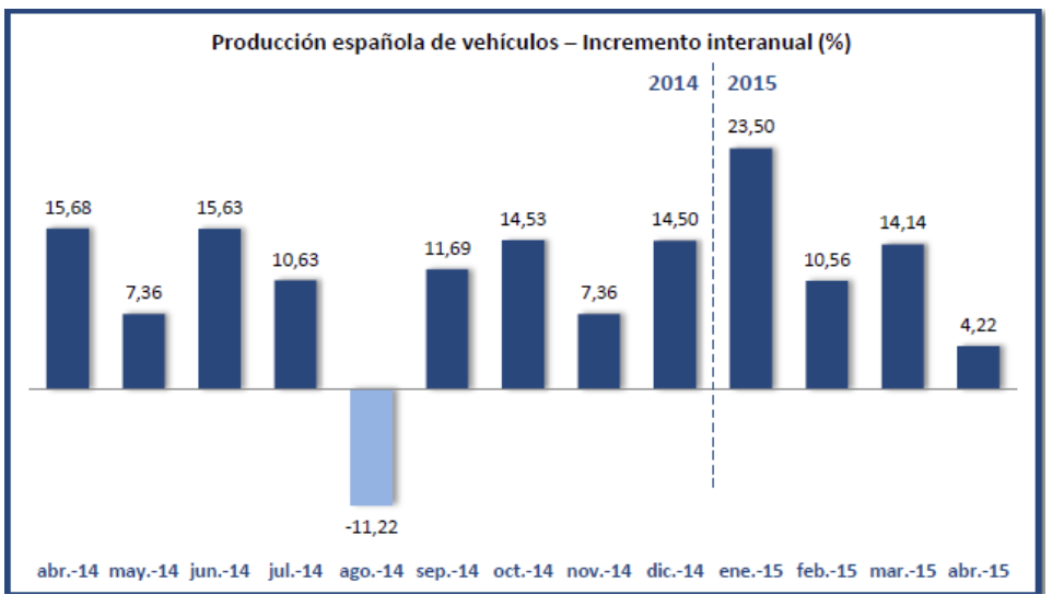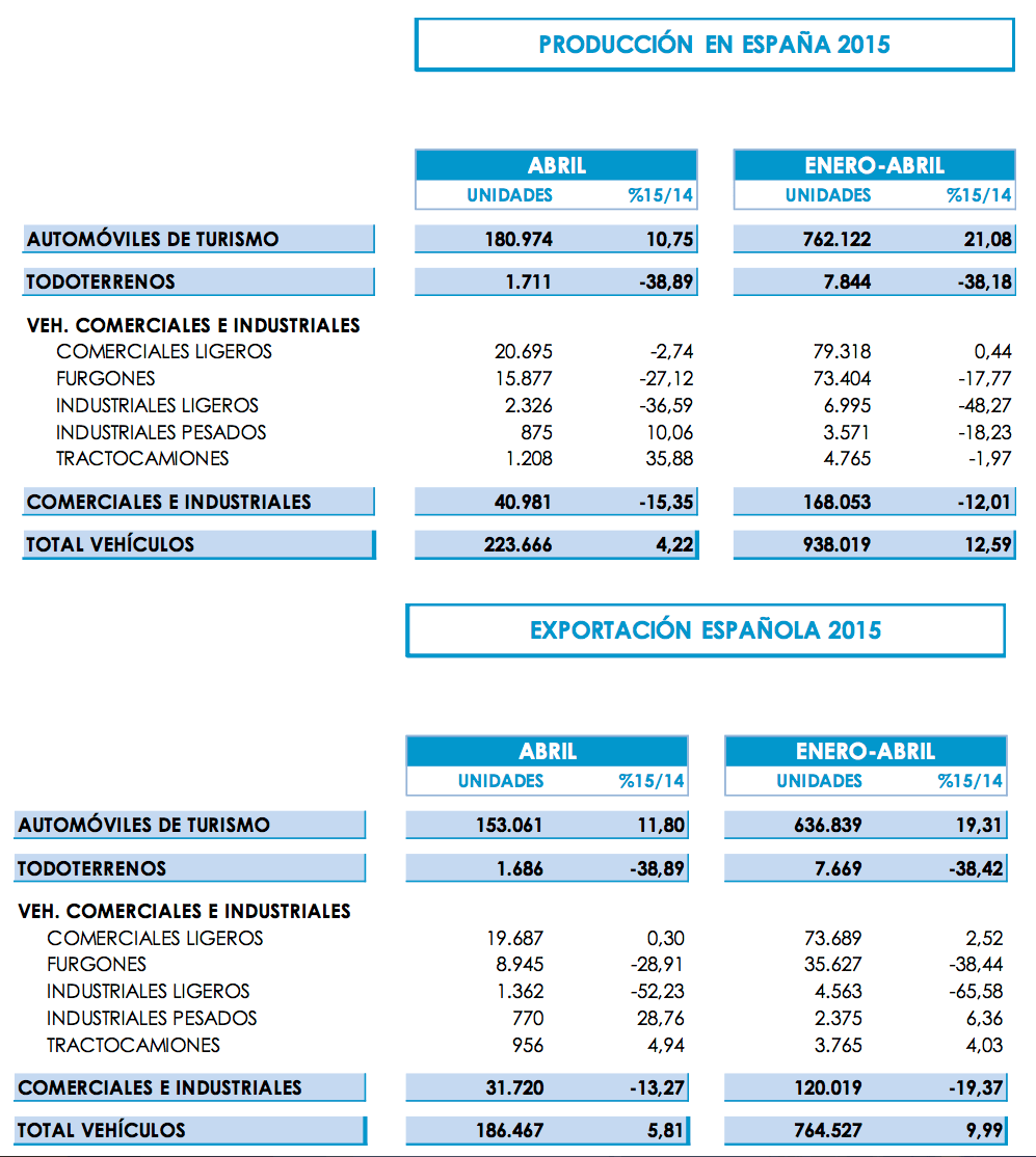 Barcelona, 26 de mayo del 2015.- Según ha informado la patronal del automóvil, Anfac, la producción de vehículos en España crece un 12,5%, alcanzando ya casi el millón de unidades (938.019). El mes de Abril también refleja datos positivos, aunque más moderados con un 4,22%% más y 223.666 unidades. La adaptación de las líneas de producción a los nuevos modelos asignados, junto con el periodo vacacional de Semana Santa han influido en el resultado del mes de Abril. Los turismos siguen siendo el motor en la producción de vehículos. Este segmento suma en los cuatro primeros meses del año un crecimiento del 21,08% con 762.122 turismos fabricados. El resto de segmentos a excepción de los vehículos comerciales registran tasas negativas hasta el mes de Abril.