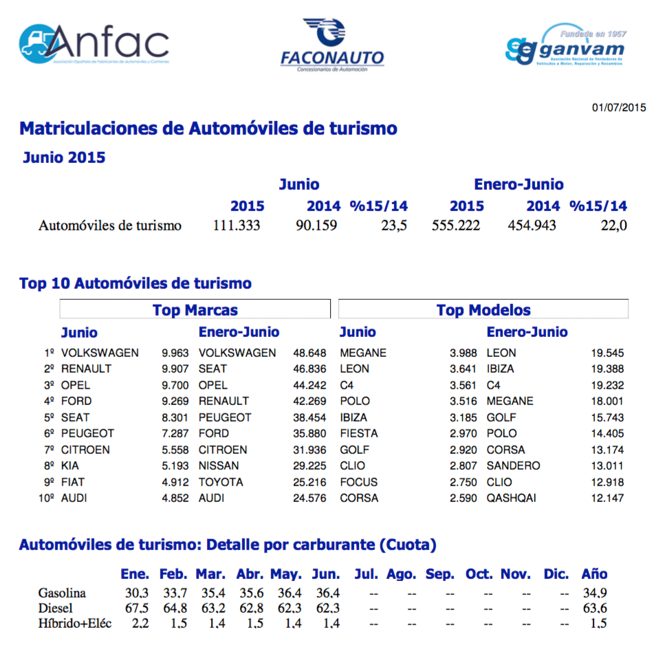 David Barrientos, Director de Comunicación de ANFAC afirmó que, “Primer semestre del año y el mercado del automóvil crece por encima del 22%, superando el medio millón de turismos vendidos. Un magnífico resultado para el automóvil, pero también para otros doce sectores económicos. El mercado acumula 22 meses de crecimientos y 9 trimestres seguidos de alzas. Esto demuestra que el mercado español tiene potencial para seguir creciendo y detener el envejecimiento continúo del parque. Para eso hace falta estar por encima del 1,2 millones de unidades anuales. Este año después de una espera de 7 años superaremos el millón de unidades. El mercado del automóvil infunde confianza a los consumidores y mantiene un efecto positivo sobre el consumo interno, pieza clave para que el PIB español siga creciendo. Junio también ha sido el segundo mes del año en el que se han superado las 100.000 unidades, con unas cifras de ventas de 5.300 coches diarios. No será el último mes, somos optimistas de cara al mes de Julio. Ya se ha superado el medio millón de unidades, es decir, se ha cumplido la mitad del objetivo de este año. No obstante, hay que seguir animando el mercado para mantener estos crecimientos y aspirar a un mercado más acorde con el nivel de desarrollo económico del país.”