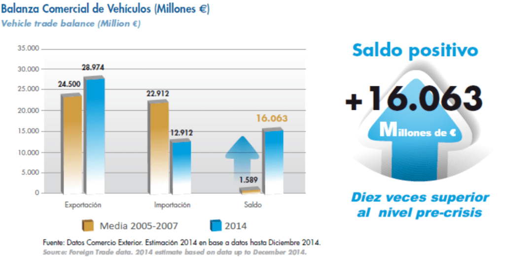 Las exportaciones de vehículos continúan siendo un renglón elemental del impulso del sector. El sector de automoción representa el 17,6% de las exportaciones españolas, es decir, casi 1 punto porcentual más que en ejercicio anterior. El automóvil es el sector que mejor balance comercial presentó en el año 2014. Se alcanzó un superávit comercial de 16.063 millones de €, una cifra diez veces superior al nivel pre‐crisis. En dos años, el automóvil suma más de 32.000 millones de € de superávit comercial, algo que no había ocurrido nunca en la historia. Los Planes PIVE moderaron durante 2014 el continúa envejecimiento del parque de turismos. No obstante, la antigüedad del parque de turismos en España se situó el año pasado en 11,3 años de media de antigüedad, frente a los 10,8 años de 2013. Para poder incrementar el ritmo de descenso de la edad media del parque es necesario mantener un mercado por encima de 1,2 ó 1,3 millones de turismos al año.