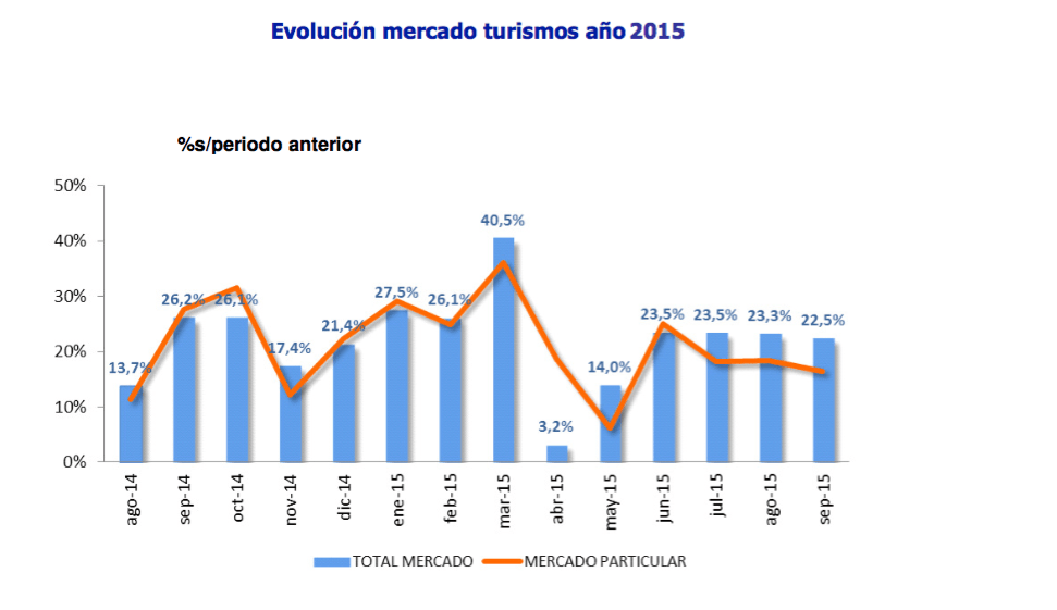 Barcelona, 7 octubre del 2015.- ANFAC ha informado que septiembre, marca el noveno trimestre consecutivo de crecimiento en el mercado. En cifras, en el mes se han matriculado un total de 69.826 unidades, lo que representa un crecimiento del 22,5%. Es el mejor mes de Septiembre desde el año 2009. Este tercer trimestre ha finalizado con un crecimiento del 23% y casi 230.000 unidades matriculadas. En lo que llevamos de año, el mercado presenta un crecimiento acumulado del 22,4% con un volumen de 783.892 unidades. La tendencia continúa siendo positiva y lo refleja el hecho de que el volumen de los últimos doce meses (año móvil) ya roce el millón de unidades (998.000 matriculaciones).