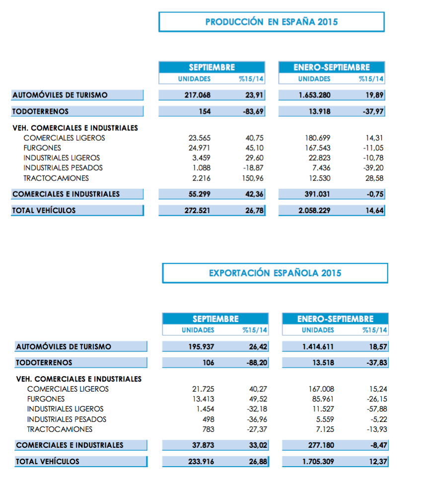 Barcelona, 27 de octubre del 2015.- ANFAC ha informado que la fabricación de vehículos en España, experimenta un importante crecimiento en el mes de Septiembre con un 26,78% y un total de 272.521 unidades. Las fábricas de vehículos fabricaron 9.000 unidades al día, siendo el volumen más alto para un mes, desde Abril de 2008. Los nueve primeros meses del año acumulan tasas positivas, con un alza del 14,64% superando ya los 2 millones de unidades fabricadas (2.058.229). A falta de un trimestre para finalizar el año, la previsión de producir 2,6 millones de coches es casi una realidad.
