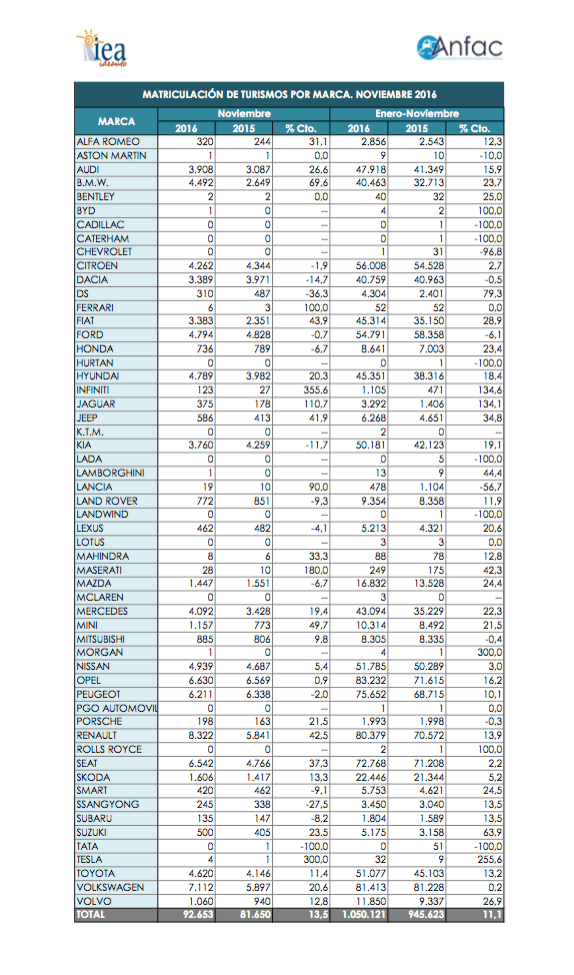 Barcelona, 2 de Diciembre de 2016.- Según informan ANFAC, FACONAUTO y GANVAM, noviembre, registra un incremento por octavo mes consecutivo en el mercado de turismos del 13,5%, con un volumen de 92.653 matriculaciones. Sin embargo, hay que destacar que la falta del PIVE ha provocado una moderación en el canal de particulares con apenas un 3,9% de crecimiento. A pesar, de esta ralentización, Noviembre ha marcado el mejor registro para este mes desde el año 2007. En el período acumulado, Enero-Noviembre, el mercado crece a un ritmo del 11,1% con un volumen que ya supera el millón de unidades, en concreto 1.050.121 matriculaciones.