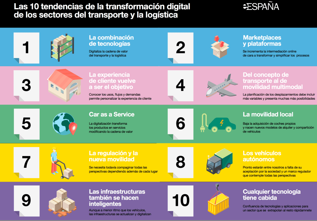 Tendencias de la transformación digital del transporte y la logísticaSegún el estudio, la combinación de tecnologías, dispositivos o aplicaciones –como el cloud computing, la telefonía móvil, el Internet de las Cosas, los wearables, el big data, las redes sociales o la economía colaborativa– está contribuyendo a la transformación digital y al rediseño de los sectores del transporte y la logística. En esta transformación, casi revolución, se está pasando de los grandes proyectos de infraestructuras civiles a unos sistemas de transporte potenciados, de una forma casi invisible por las TIC, que los hacen más inteligentes, seguros, eficientes e integrados. Algo parecido sucede con la logística de los objetos y mercancías, especialmente debido al auge del comercio electrónico. Cada vez más empresas venden un mayor número de productos online y precisan mejores y más ágiles servicios de entrega, ante un consumidor muy conectado y cuyas expectativas crecen.