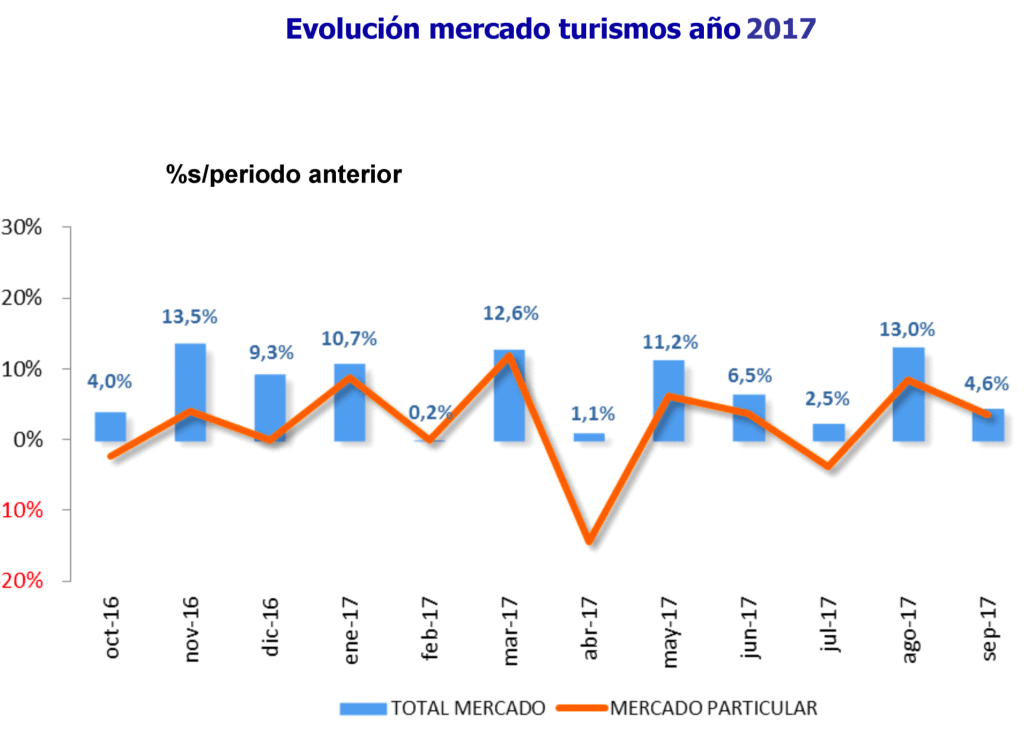 Durante los nueve primeros meses del año el mercado de turismos alcanzó 933.142 matriculaciones, lo que supone un 6,7% más que en el periodo enero-septiembre de 2016. En el conjunto del año las matriculaciones por parte de los particulares son las que menos crecen, con un 2,2% de subida, mientras que los canales de empresas (+13,7%) y alquiladores (+8,9%) alcanzan tasas superiores.