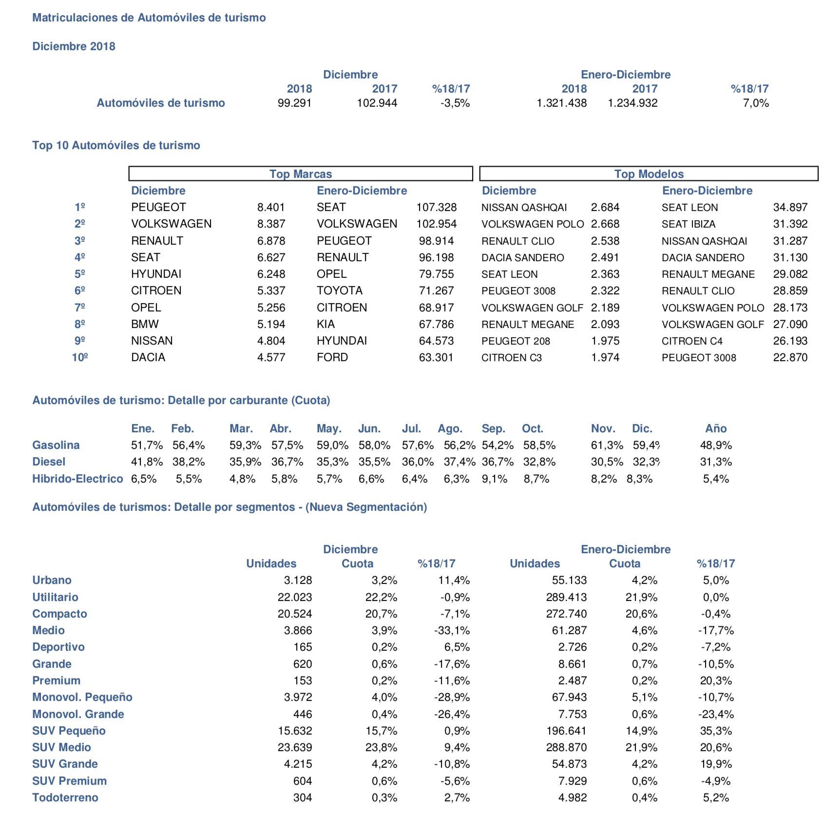 Raúl Morales, director de comunicación de FACONAUTO, afirmó que “en líneas generales se puede hablar de un año correcto para el mercado de la automoción nacional. Un crecimiento cercano al 7% no es un mal dato. Sin embargo, el ejercicio se ha estropeado en el último cuatrimestre, por dos causas. En primer lugar, debido a la entrada en vigor del protocolo de emisiones WLTP, que adelantó ventas en verano y que desabasteció a algunas redes de coches homologados con el nuevo protocolo. En segundo lugar, y más importante, por el clima negativo que rodea actualmente a la automoción, lo que ha retraído ventas. Ahora, el mal dato de diciembre viene a confirmar el retroceso en las matriculaciones, que no se explica ya sólo por circunstancias sectoriales, sino que hay que tener en cuenta la bajada en la confianza de los consumidores, la posibilidad de una desaceleración económica o la evolución del contexto político. Esto nos deja ante un año 2019 teñido de incertidumbre, que se verá también influenciado por posibles cambios normativos o de fiscalidad que afecten al sector. De esta manera, sólo podemos que el mercado siga esta tendencia negativa en el arranque del presente ejercicio.”.