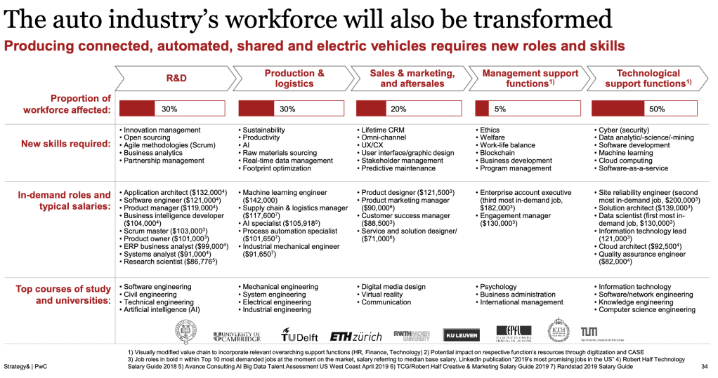 We also believe five new sustainable roles for suppliers will emerge: as smart infrastructure enablers; automated shuttle-vehicle manufacturers; platform providers; mobility intelligence providers; and vehicle feature and demand providers. Finally, new flexible and hybrid organizations need to be created, and due to the scarcity of people with the right skills, the auto industry must upskill its existing workforce to perform digital and data-management roles.