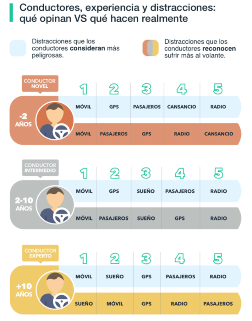 Preguntados por las distracciones que los conductores reconocen sufrir más, la experiencia marca diferencias. Así, los conductores noveles e intermedios admiten que el uso del móvil es la distracción más frecuente, seguida de los pasajeros acompañantes; mientras que los más expertos se inclinan por el sueño y después del móvil.