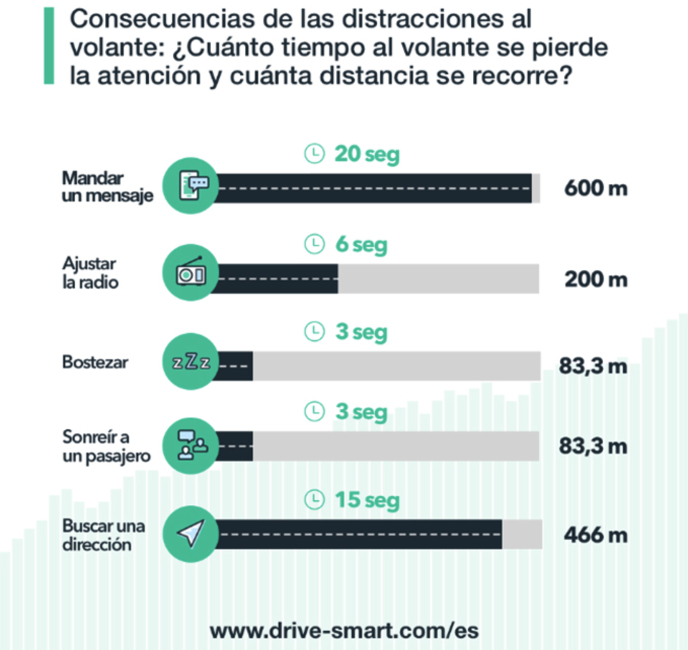 Conducir implica mantener la atención permanentemente en la carretera. Sin embargo, a veces, nos empeñamos en hacer otras cosas porque pensamos que no es peligroso. Son solo unos pocos segundos que pueden resultar letales. En el estudio de DriveSmart, se han incluido los segundos y la distancia que recorre un vehículo cuando enviamos un mensaje con el móvil o simplemente bostezamos.