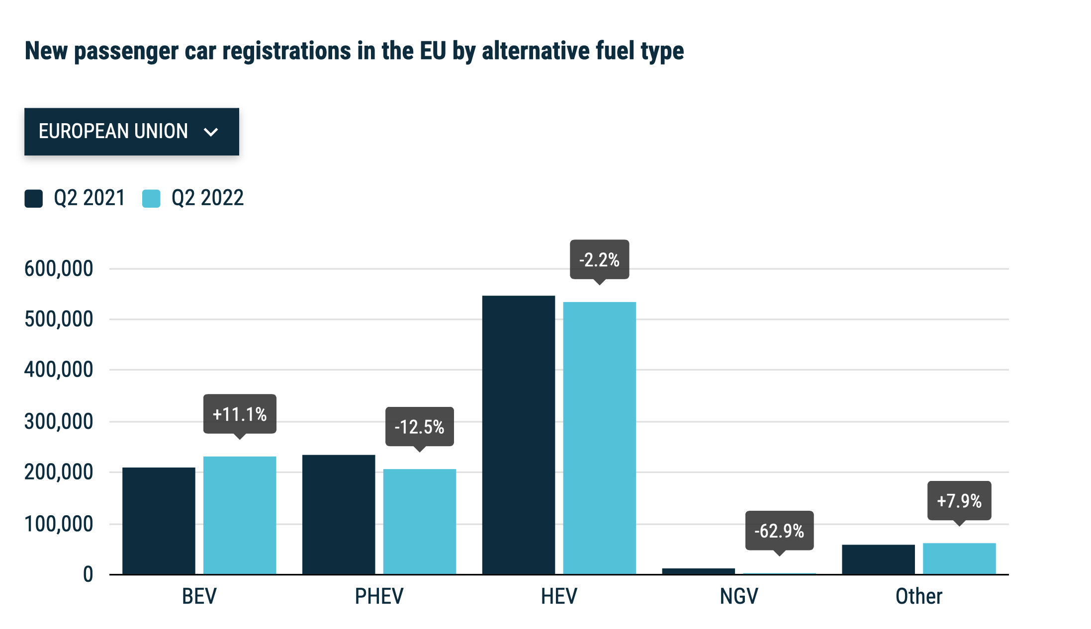 In the second quarter of 2022, sales of battery electric vehicles continued to expand in the EU, accounting for 9.9% of total passenger car registrations.
