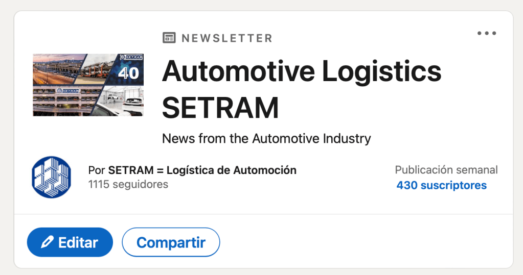 Barcelona, 14 de noviembre de 2022.- Hace 25 semanas, SETRAM lanzó su nuevo Newsletter Semanal sobre la industria mundial de la automoción. Su nombre: “Automotive Logistics SETRAM” y se encuentra alojado dentro de la Página Corporativa de SETRAM en Linkedin. Después de las primeras 25 ediciones, este Newsletter suma 430 suscriptores profesionales, relacionados con el mundo del automóvil. Cada viernes, a media mañana, SETRAM selecciona las noticias internacionales más destacadas por medios de comunicación internacionales, especializados en la industria de la automoción. De esta forma, se destacan y anticipan informaciones desde los países de origen.