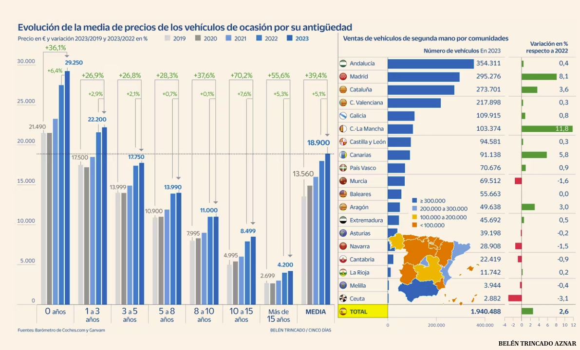 Barcelona, 20 de febrero del 2024.- “Comprar un coche viejo, usarlo unos meses y venderlo más caro”. El periódico Cinco Días informa sobre esta nueva tendencia en el mercado de ocasión de automóviles. Los datos son los siguientes: