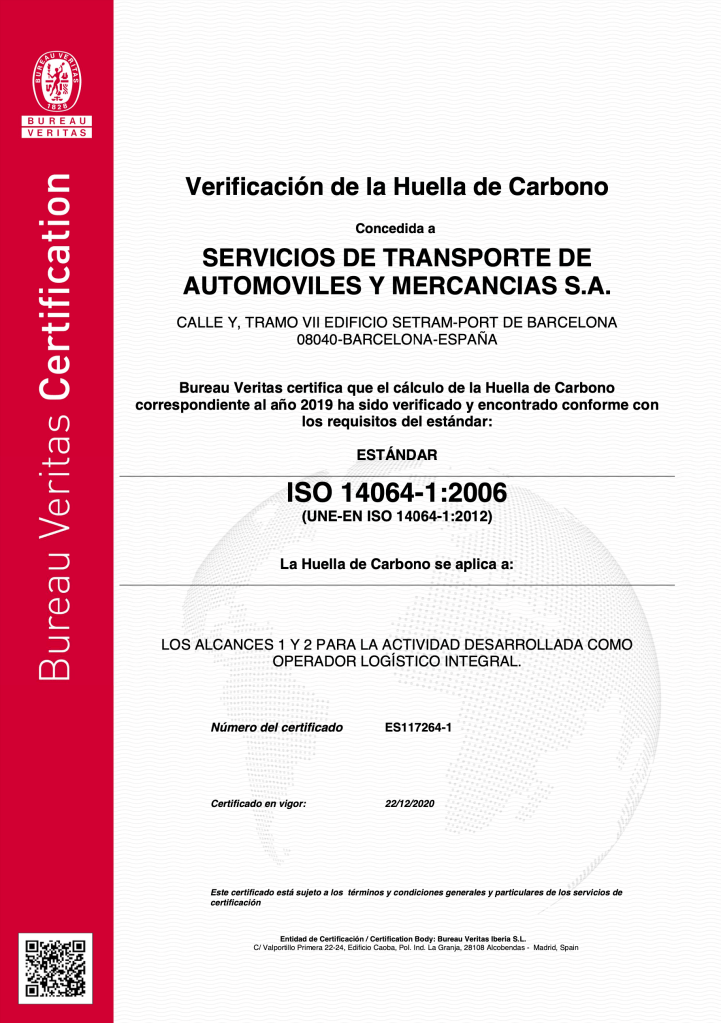 Barcelona, 13 de enero del 2021.- SETRAM, operador multimodal especializado en logística de automoción para el vehículo terminado desde 1982, ha conseguido la certificación ISO 14064 como empresa sostenible en emisiones de gases de efecto invernadero. A nivel nacional, SETRAM es la primera empresa logística para vehículo terminado en obtener el certificado ISO 14064. SETRAM ha superado todos los trámites en la medición de su huella de carbono, al igual que en el año 2017 con la obtención del certificado ISO 14001. De esta forma, SETRAM lidera un compromiso riguroso con su impacto medioambiental y se convierte en uno de los operadores logísticos más socialmente responsables.
