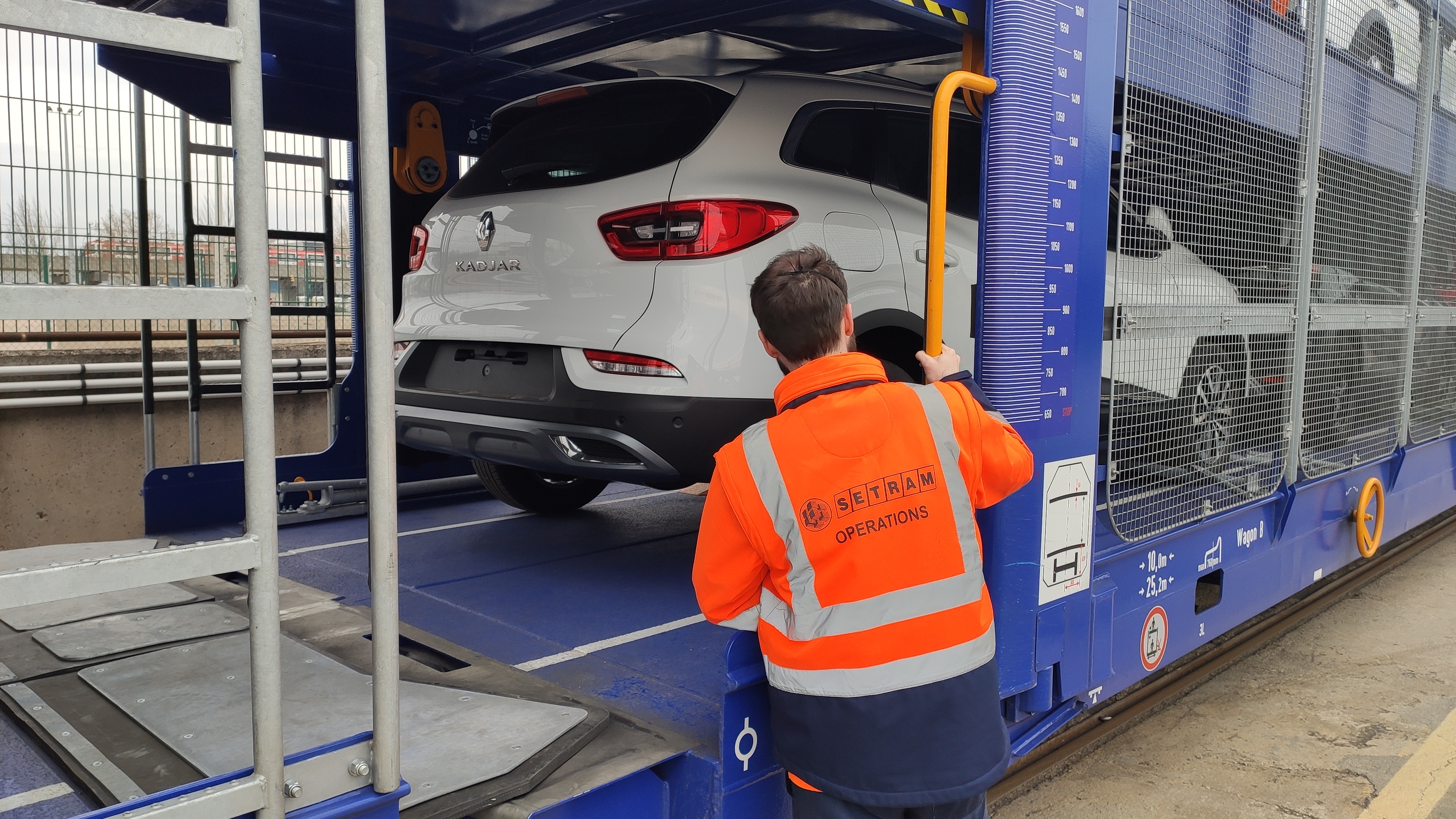 Barcelona, 12 abril del 2022.- SETRAM, Operador multimodal especializado en logística de automoción para el vehículo terminado desde 1982, participa en el transporte de coches Renault desde sus fábricas hasta Barcelona, y la carga en tren hacia países del Este. La previsión inicial es de 10.000 unidades al año con un tren semanal.